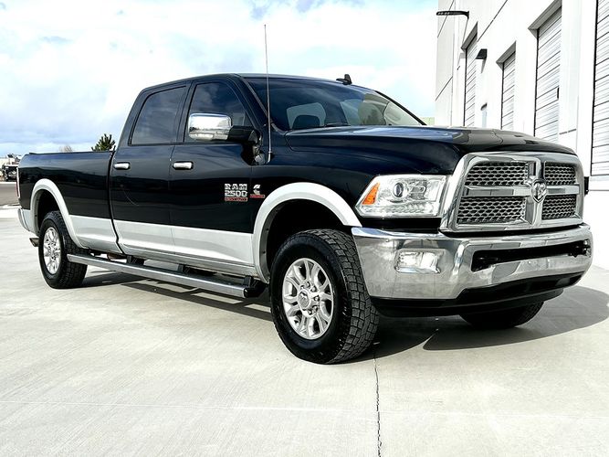 This 2014 Ram 2500 Laramie Crew Cab 4x4 is a true Colorado-built workhorse, combining proven Diesel capability with the comfort and refinement of the Laramie trim. Powered by the Legendary 6.7L Cummins Turbo Diesel paired with the 68RFE 6-speed automatic, this truck is engineered for long pulls, steep grades, and demanding terrain. Finished in Black Clearcoat with a black leather interior, it delivers a rugged yet upscale presence that fits Colorado life perfectly.