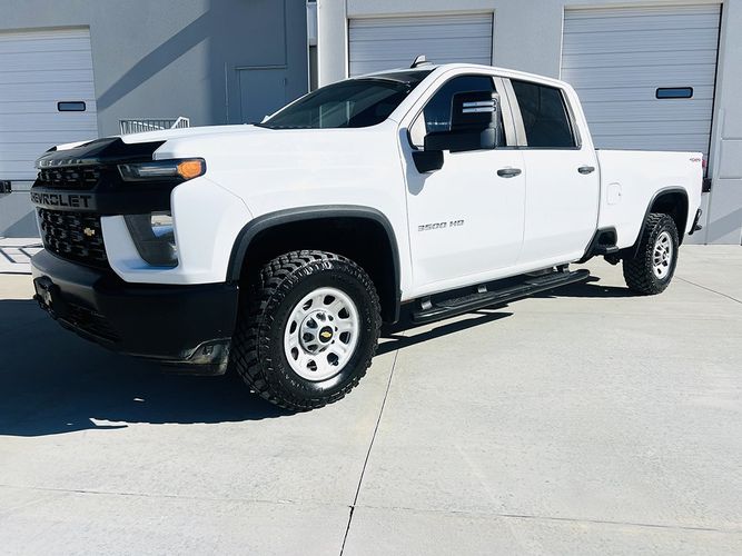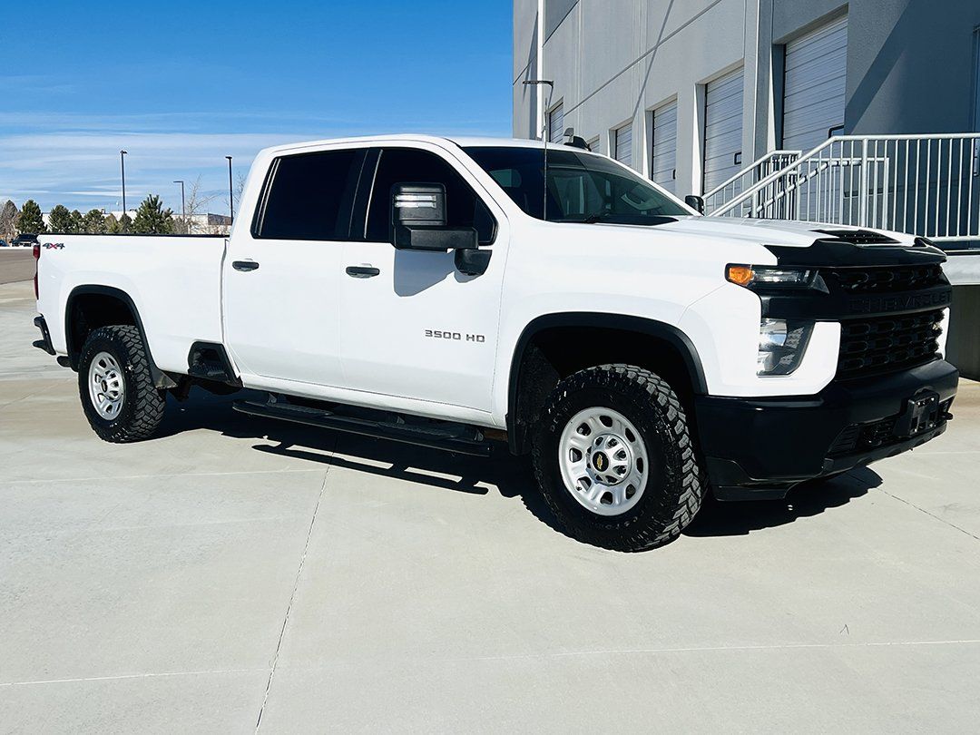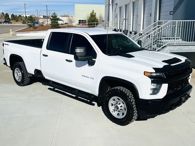 Unleash Serious Capability with this 2021 Chevrolet Silverado 3500HD 4WD Crew Cab Long Bed WT, a Heavy-Duty truck built for real work and long service life. With only 25,755 miles, this Silverado is in excellent condition and remains tight, clean, and mechanically strong. Finished in Summit White with a Jet Black Leather interior, it carries a Clean Colorado Title, is 1-Owner Fleet Maintained, and shows no accident history, making it a rare low-mile HD truck with a documented background.