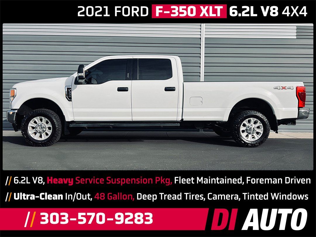 This 2021 Ford F-350 Super Duty XLT 6.2L V8 Long Bed 4x4 is fleet maintained, foreman driven, and carries a clean Colorado title with no accident history. It presents ultra-clean inside and out, showing consistent service and controlled use—not jobsite abuse. Straight body panels, dark tinted windows, and a clean interior confirm it was used as intended and maintained accordingly.