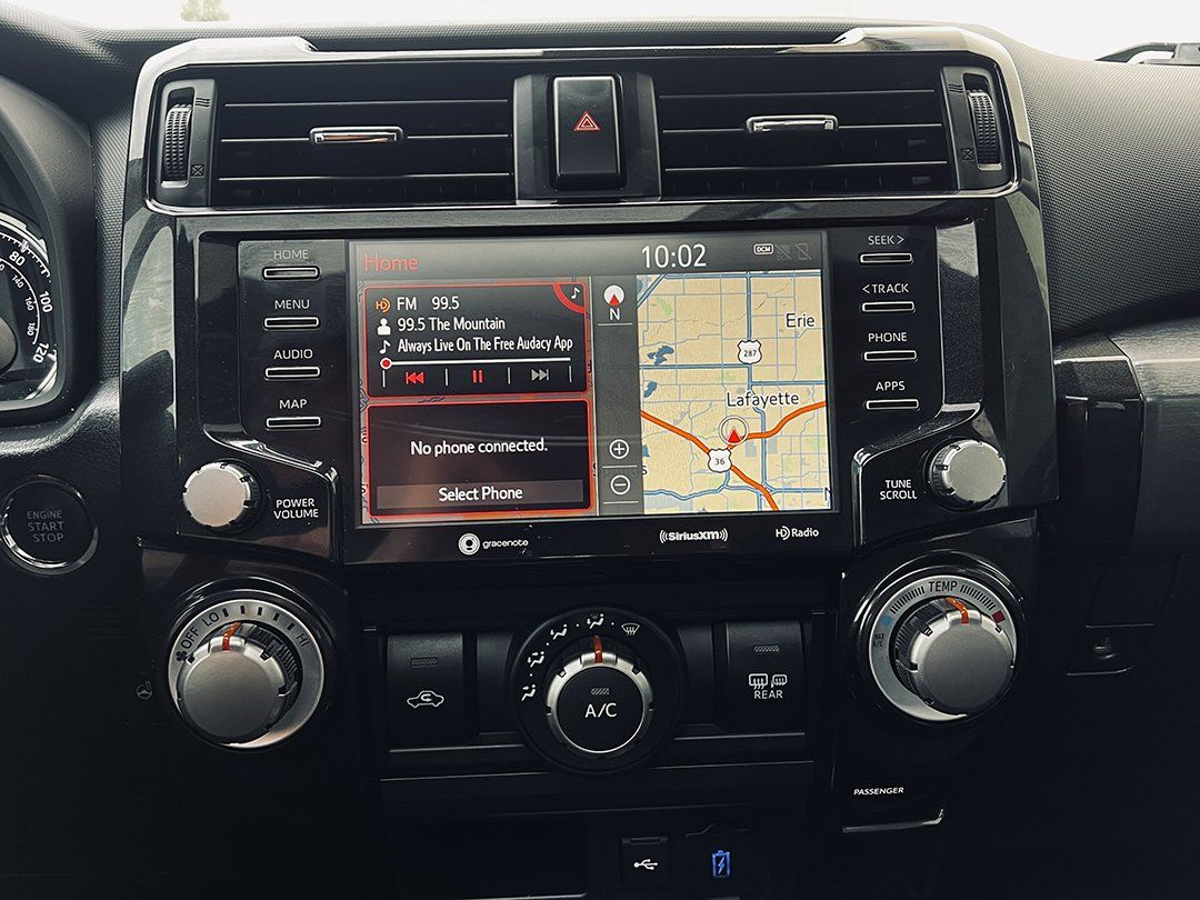 Inside, the TRD Off-Road Premium package delivers leather-trimmed seating, power and heated front seats, TRD-branded headrests, TRD shift knob, and TRD all-weather floor mats. The 8-inch touchscreen features navigation, Apple CarPlay, Android Auto, and an 8-speaker premium audio system. The power tilt/slide moonroof adds everyday usability and ventilation, especially for Colorado driving.